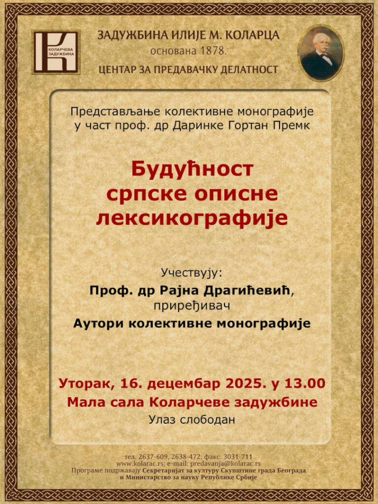Промоција колективне монографије у част проф. др Даринки Гортан Премк У Коларчевој задужбини, 16. децембра 2025. године одржано је представљање колективне монографије Будућност српске описне лексикографије, која је посвећена проф. др Даринки Гортан Премк. На промоцији су говорили приређивач и уредник проф. др Рајна Драгићевић и аутори, докторанди професорке Драгићевић.